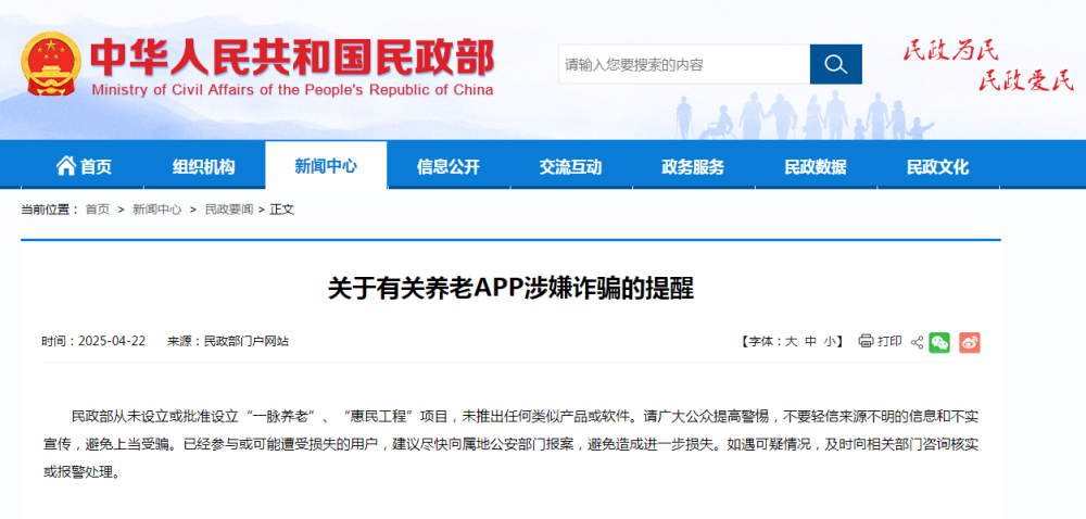 近期多地老人遭遇新型养老骗局。4月22日国家民政部发布重要公告:近期发现“健康养老”“惠民工程”“智慧养老”等名头的手机软件存在诈骗行为,官方从未推出过此类养老服务软件。