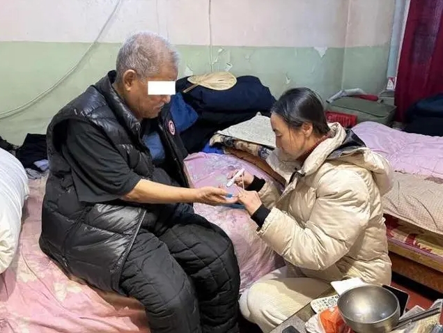 下午4点,照护管理师陆亚静骑着电动车来到一位78岁老人的家。这位老人患有肾病,每周需要透析三次,视力也严重下降。陆亚静为老人测量血压、血糖、血氧等生命体征,检查居家环境,了解老人近期身体状况和生活需求,并安排了上门修脚服务。