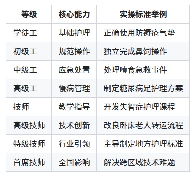 - 大师段:特级技师→首席技师(需解决行业级难题,如压疮护理新技法研发)